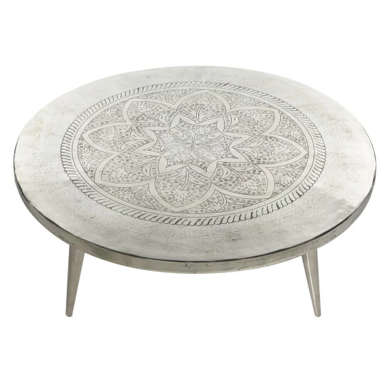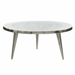 This traditional style inspired silver aluminum round coffee table features a large elaborate flower design on the surface with a round design and 4 round legs. Useful and elegant, coffee tables are more than just a pretty piece of furniture in front of your couch. Sit back, relax, but don’t put your feet up on this coffee table. This item comes shipped in one carton. Suitable for indoor use only. Made in India. Traditional theme. Maximum weight limit is 100 lbs