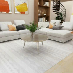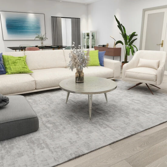 - The coffee table features a metallic silver finish