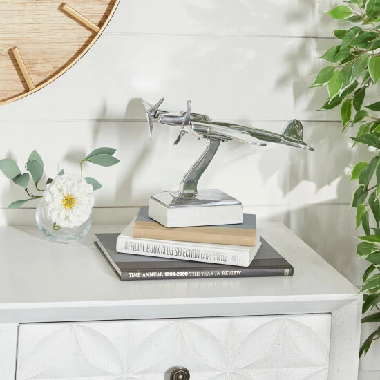 Silver-theme enthusiasts, hobbyists, novelty item fans, and professionals will take interest in this airplane table display with an aluminum and a stoneware platform. It’s polished and modern on the outside but, at the same time, it exudes an industrial craft feel. Display it on work desks, shelves, dark-colored wooden dressers, side tables, or countertops. This steel aircraft figurine was made in India. A polished steel exterior makes this a perfect addition to modern interiors. Suitable for indoor use only. Marble is a product of nature and no two pieces are exactly alike, it is prone to variations in color and/or patterns in the material that adds to the beauty and charm of the piece. Made in India. Modern design. This item comes shipped in one carton. Ceramic sculpture makes a great gift for any occasion.