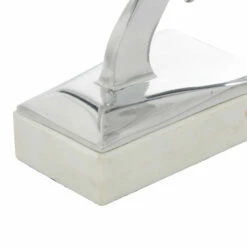 - This sleek sculpture features a polished glossy silver finish with a matte white marble base