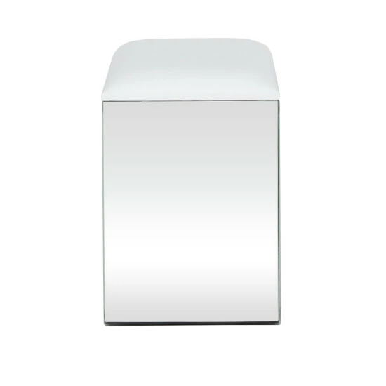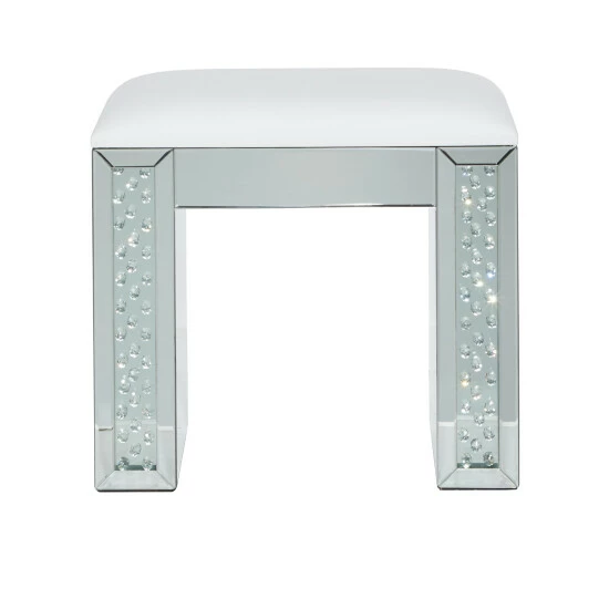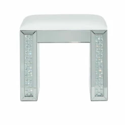 - A wood and glass accent stool featuring white seat cushion and mirrored base with crystal bead embellishments