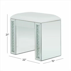 This wood and glass cushioned stool is designed to be attractive and stylish in any glam-styled space. Whether placed in your home office, living room, lobby, or game room, this decorative stool provides a chic and welcoming look. Made with a sturdy base, it is perfect for creating an inviting atmosphere for you and your guest. Designed with black rubber at the base that prevent scratching as well as sliding around. This stool features 3″ cushion thickness. Suitable for indoor use only. Maximum weight limit is 250 lbs. Glam theme.