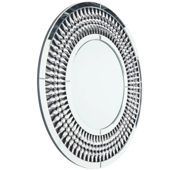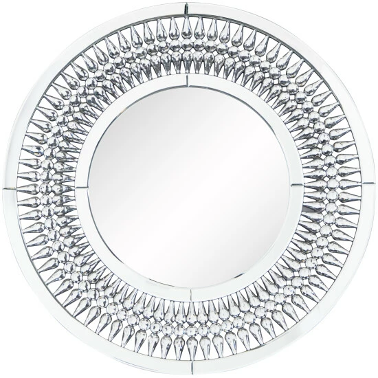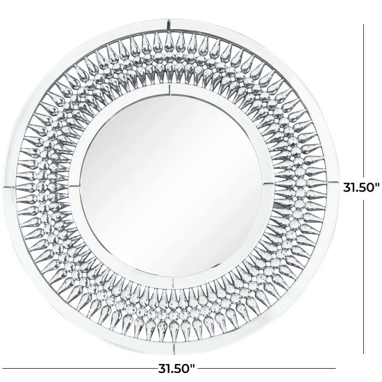 - Reflective silver and clear rhinestone finish highlight this round modern mirror wall decor