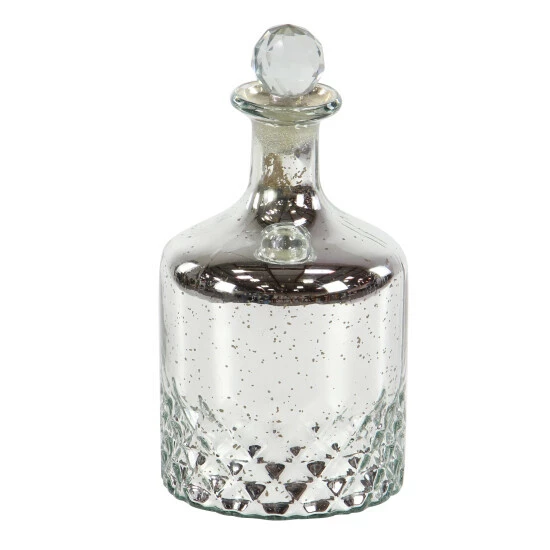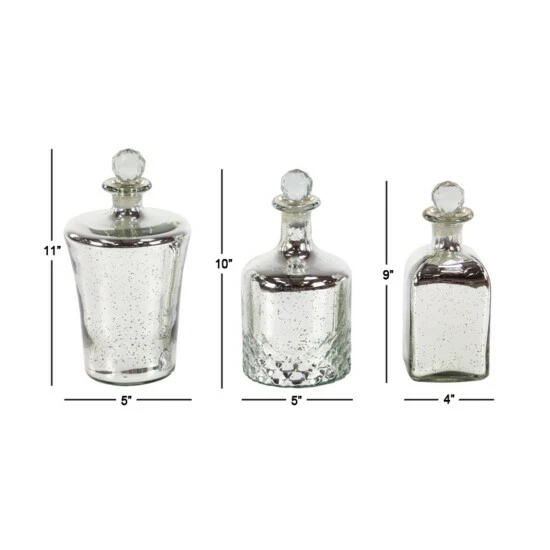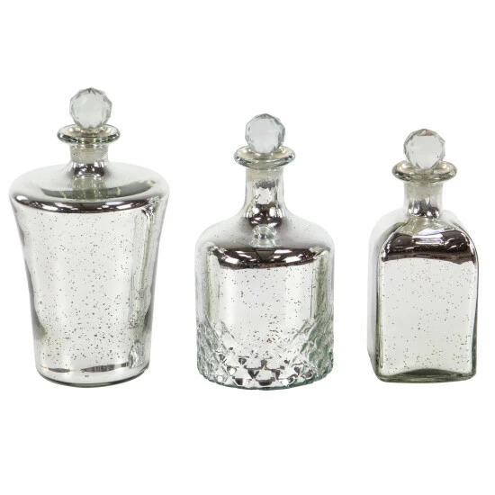 - A set of decorative glass bottles with stoppers with a radiant metallic silver finish