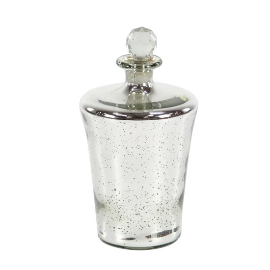 Add a spark of elegance to dull home interiors with this set of decorative glass bottles. Each bottle has an irregular shape and features a spheroid glass stopper. The metallic silver shine of these bottles amplifies the sophistication of luxe homes. Place long-stemmed flowers and use as stylish vases in living rooms or fill with essential oils and fragrances to glam up the boudoir. This item comes shipped in one carton. Suitable for indoor use only. Made in India. Each set comes with 3 glass stopper bottles. Glam inspired.