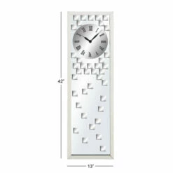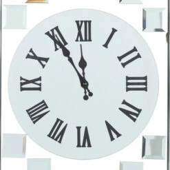 Add this refined glass mirror clock to your space and create a blend of amazing modern or contemporary theme. This lovely accent piece provides next level charm and unexpected elegance to your space. This mirror clock features rectangular stainless steel frame, clock face with Roman numerals, and abstract glass tile design. Feel free to hang this accent decor piece in your lobby, hallway, living room, or bedroom. Display on wall with other accent pieces for a more beautiful and stylish home. Runs on a single AA battery. The clock mechanism runs silent. Item features metal loop for easy and secure hang. Not include.. Suitable for indoor use only. Glam theme. This item comes shipped in one carton.