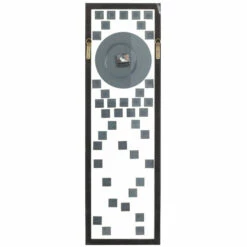 - Designed with abstract glass tile accents, features a clock with round dial and black Roman numerals