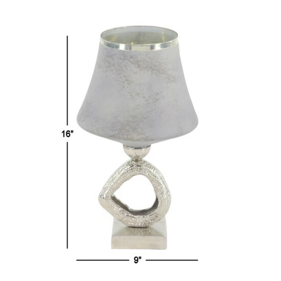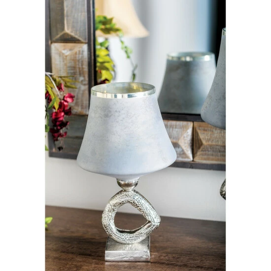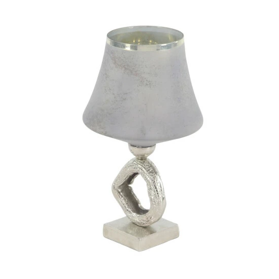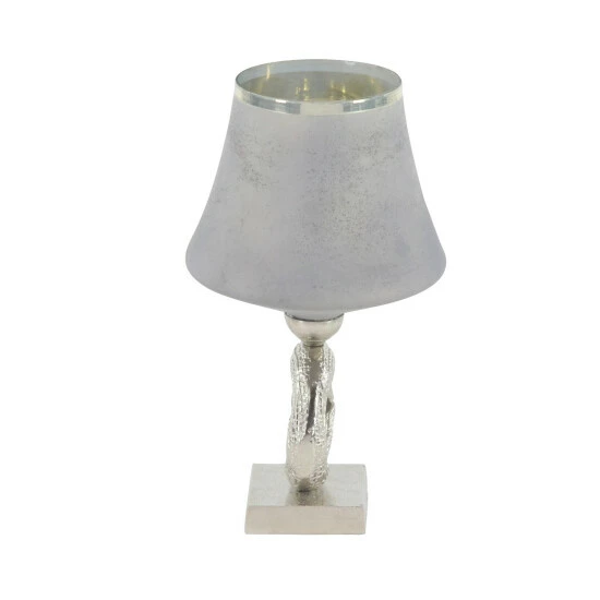 Give your candles a unique home with this lamp-style candle holder. Crafted from glass and aluminum materials, it features a gray-finished shade supported by a textured silver-finished, irregularly shaped stand and a silver-finished, square base. Its bobeche is placed inside the shade to protect the candle flame from high winds. Add this to your side table, mantle or console and give your guests something to talk about.