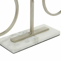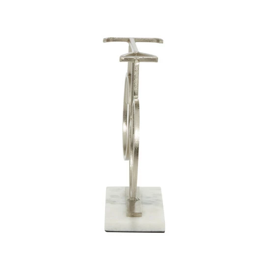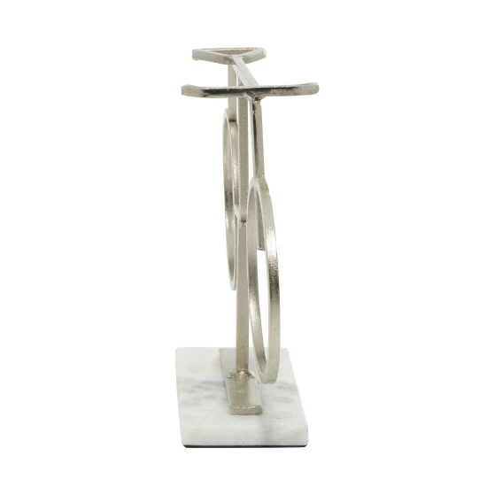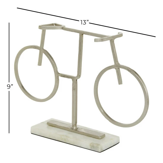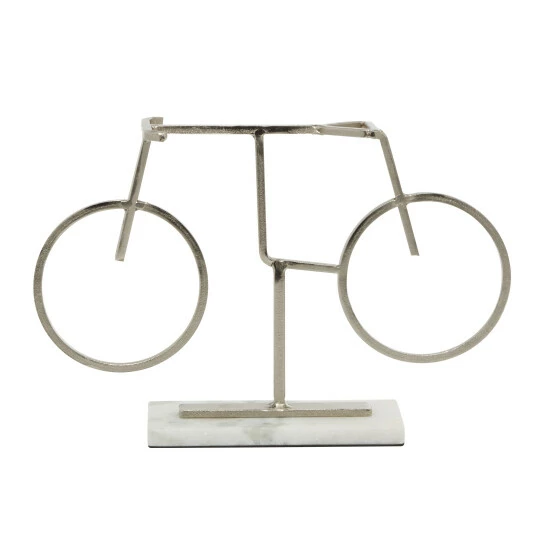 Complete your contemporary or modern look with this aluminum bicycle sculpture table decor. A minimal modern style bicycle with clean lines and smooth round wheels is propped up and attached to a white marble base with natural gray veining by a silver post. The base is sealed with rubber to prevent scuffs and sliding, ensuring you can enjoy this lovely sculpture on any surface. Designed with black rubber stoppers at the base that prevent scratching furniture and table tops, as well as sliding around. This item ship in one carton. Suitable for indoor use only. Marble is a product of nature and no two pieces are exactly alike, it is prone to variations in color and/or patterns in the material that adds to the beauty and charm of the piece. Made in India. Contemporary design. Metal sculpture makes a great gift for any occasion.