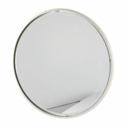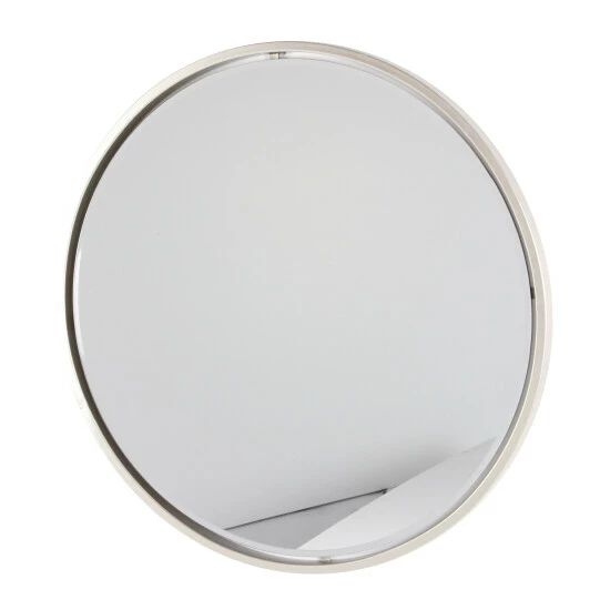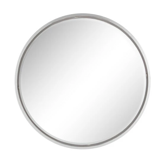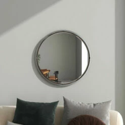 Stylishly minimal, this extra large wall mirror is perfect for contemporary spaces, or minimal rooms that need a finishing touch. The large iron frame is a simple, smooth metallic silver finish and is slightly offset from the round mirror inside. Working with any color palette or pattern, this large round mirror serves as a stunning vanity mirror, accent mirror in your living room or dining room, and will reflect light beautifully to open up your space. Suitable for indoor use only. This item comes shipped in one carton.