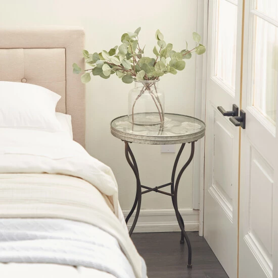 This metal table with glass top will make an excellent side table for your farmhouse style inspired living room configuration with the right sofa set and matching décor. Use it as an accent piece in the living room, library, bedroom, waiting areas, or hallways of you home. A compact friendly table providing you with additional storage space any where in your home. This item comes shipped in one carton. Stands on 4 curved metal legs with rubber stands. Suitable for indoor use only. Farmhouse theme. Maximum weight limit is 100 lbs