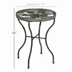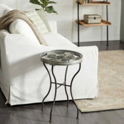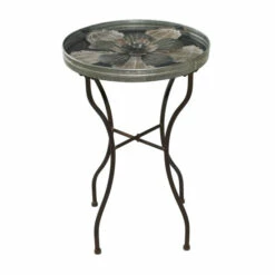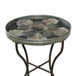 - This glass and metal side table features a beautiful flower metal sculpture in the middle protected by a glass top surface in a farmhouse style inspired design