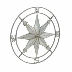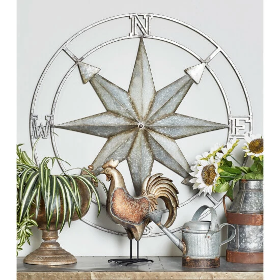 Decorate your home with this beautiful yet affordable compass wall decor from Studio 350. It features a fir wood and iron-made compass designed with a round slat, eight metal spokes, four arrow tips and stencil-style outline cardinal directions. Its distressed silver finish brings a rustic charm to this piece. Place this unique piece of art on your walls today and see how it can accentuate your space.