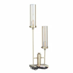 Illuminate your living room or bedroom with this silver table lamp and add a sleek and polished touch to your modern home corners. Brighten up any room to create a warming atmosphere for you and your guests with this chic table lamp. This eye catching lamp makes a playful addition to your surface space and beautifully illuminate its surrounding area. Designed with black rubber stoppers at the base that prevent scratching as well as sliding around. This item comes shipped in one carton. Two glass shades are bolted to round metal frames for sturdy support. Suitable for indoor use only. Glass cylinder shades enclose the lightbulbs of this table lamp. Comes with an on/off knob switch. Modern design.. Modern style inspired by a minimalistic design with clean lines and angular structures. This home decor is crafted with metal and glass for a solid and durable form. This accent table lamp highlights a metallic silver finish with clear glass shade offering a soft sheen effect. A pair of glossy cylinder shade is projected from the frame of this table lamp that adds a touch of glimmer and magnifies its length. Accent lamp measures 9″L x 5″W x 33″H and weighs 6 lbs