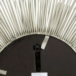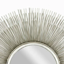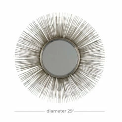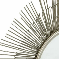 ย Amp up your modern space’s style with this extra large starburst wall decor with an accent mirror. The 3D outer “frame” features three layers of metal prongs forming a dimensional starburst pattern with a metallic silver finish. The medium round mirror inside is both a reflective accent piece and a small vanity mirror, perfect for your entryway or bedroom. Showcase this large silver wall decor piece anywhere needing a style boost. It makes a great centerpiece over your sofa or in your dining room! This wall decor is easy and ready to hang by the built-in D-ring hardware in the back. Suitable for indoor use only. This item comes shipped in one carton. Made in India. Large round silver starburst accent mirror