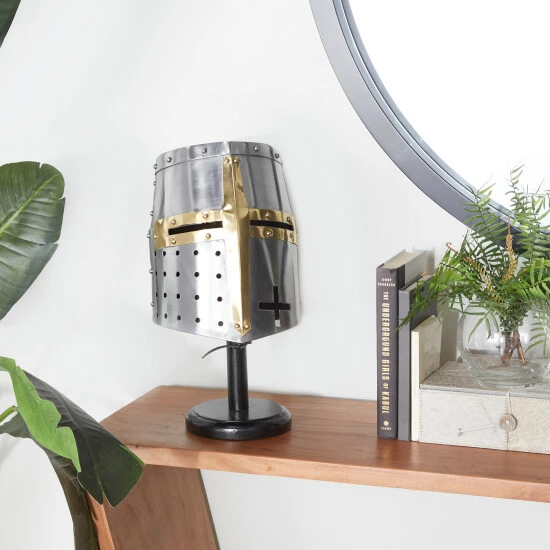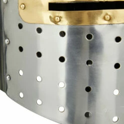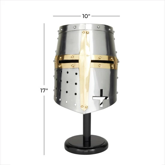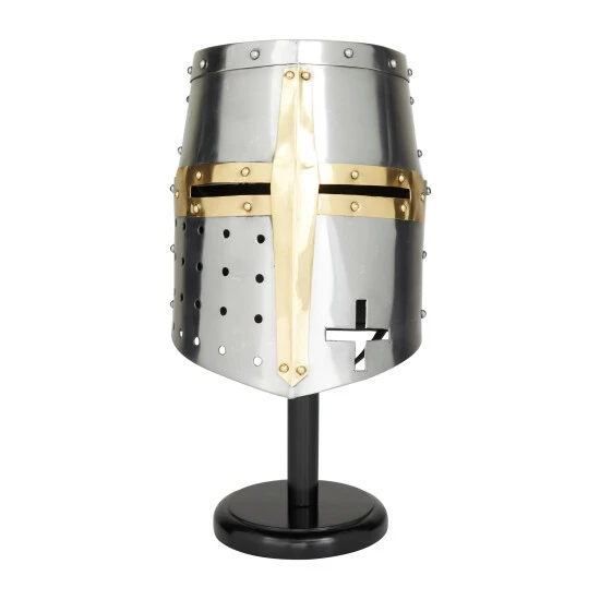 Create an artistic display in your living space with this durable and eye catching helmet. A unique and distinctive decor that adds character and historic influence into your living space. Display this medieval knight’s great helm on your tabletops to add a bold and stunning statement piece inside your home space. This item ships in 1 carton. Suitable for indoor use only. Made in India. Vintage design.