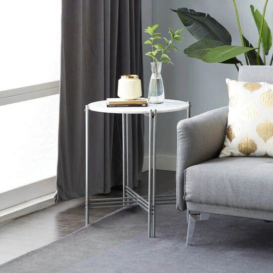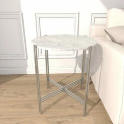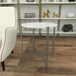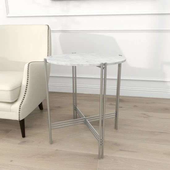 - This metal and marble accent table features a round white marble surface secured into a solid metal frame in a contemporary style inspired design