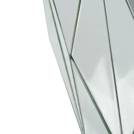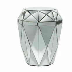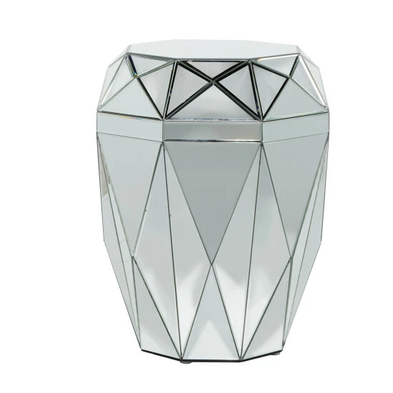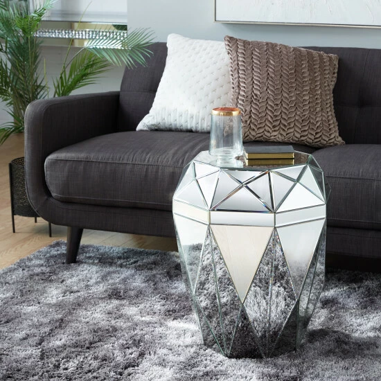 - This silver round geometric mirrored side table comes in a sophisticated silver finish that suits any glam-inspired interior design