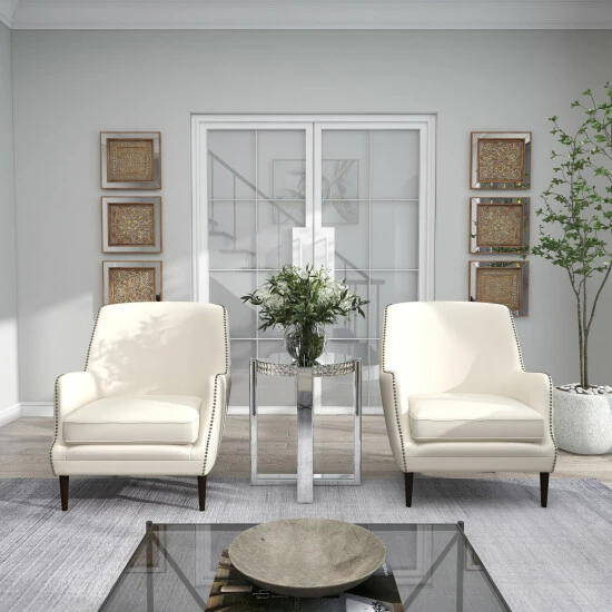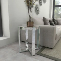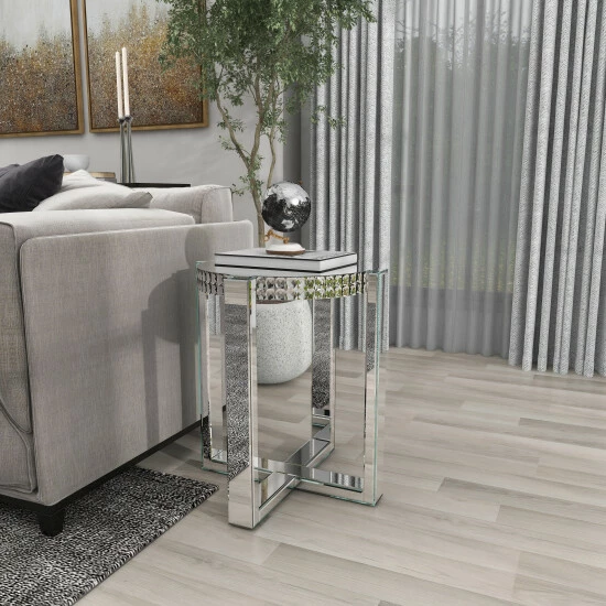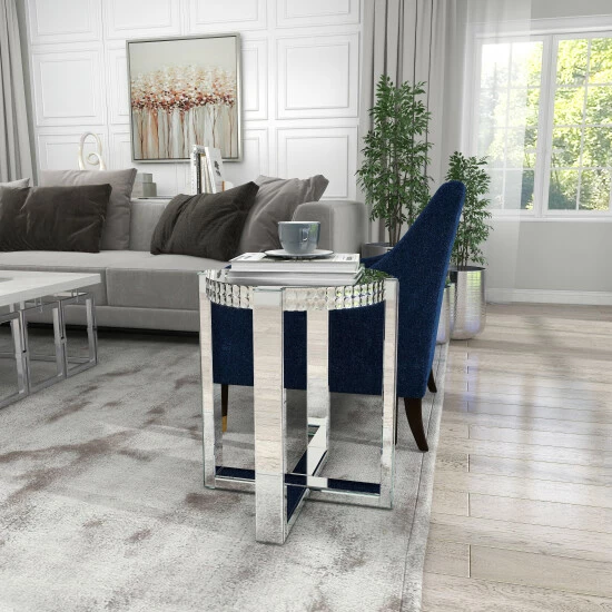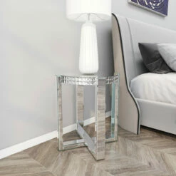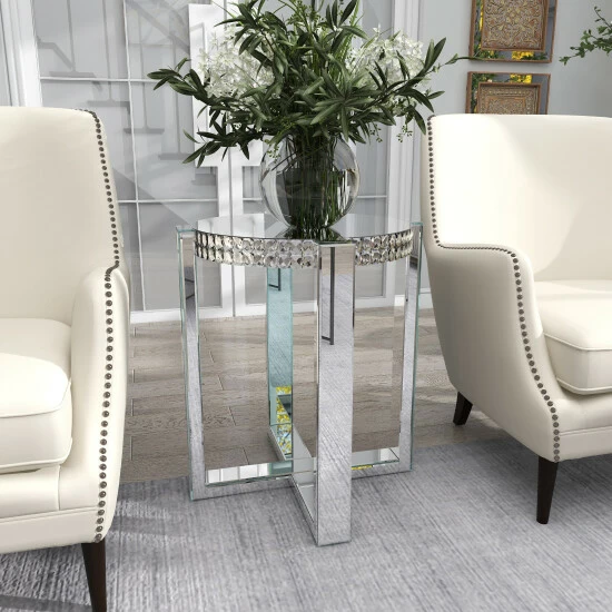 This wood and glass accent table is sure to make a bold statement in your lobby, living room, or bedroom. A compact friendly table providing you with additional storage space any where in your home. Use it as an accent piece in the living room, library, bedroom, waiting areas, or hallways of you home. Designed with rubber stoppers at the base that prevent scratching as well as sliding around. Suitable for indoor use only. Maximum weight limit is 50 lbs. This item ships in one carton. Glam theme.. Elevate your space and add a touch of luxury with this glam inspired piece. A glam-inspired side table crafted of solid and polished wood and glass materials. This round mirrored side table comes in a sophisticated silver finish that suits any glam-inspired interior design. A wood and glass accent table featuring a round shape with reflective glass panels, round bead details, and rubber stoppers at the x-shaped base. This side table measures 21″L x 21″W x 24″H and weighs 27 lbs