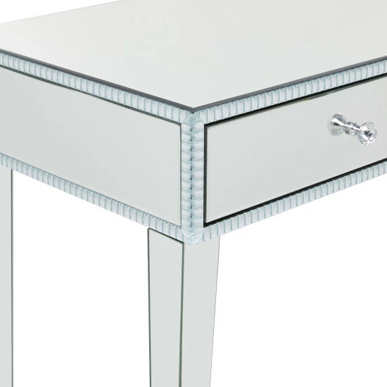 - A glam style console table showcasing silver finished reflective glass panels with clear crystal pull handles