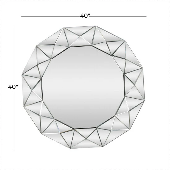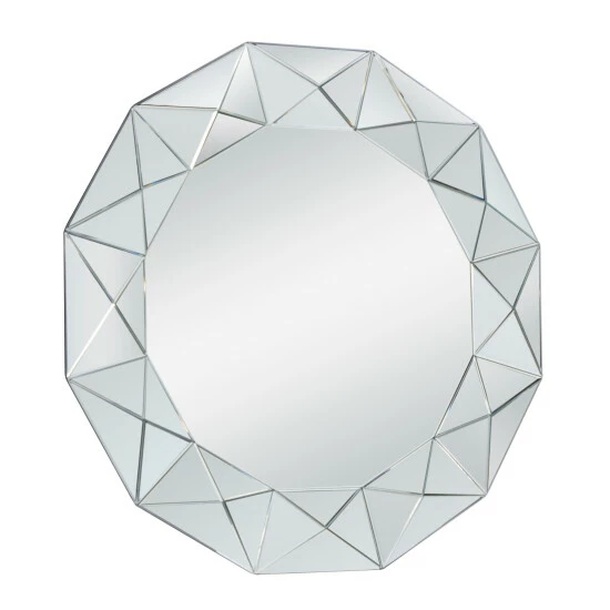 Fun and artistic, this large 12-sided wall mirror adds a dimensional geometric sculpture to your wall while illuminating your space with reflective light. Several small mirrored beveled glass triangles are laid into a pyramid shapes around the edge, creating lots of depth from the multiple angles. Securely hang by the D-ring hardware in the back in any room of the house. Suitable for indoor use only. Glam theme. This item comes shipped in one carton.
