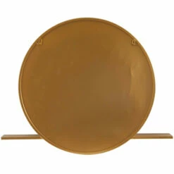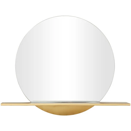 - An accent piece featuring a round reflective glass mirror furnished with a long rectangular shelf for storing small accent pieces