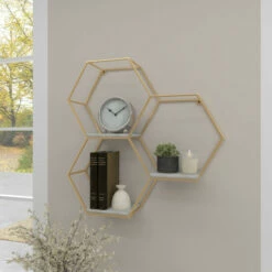 - This honeycomb wall shelf highlights a metallic gold/silver frame finish with white marble shelves