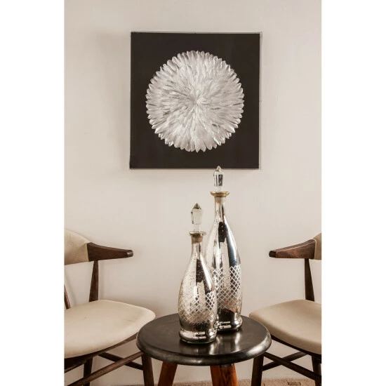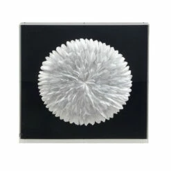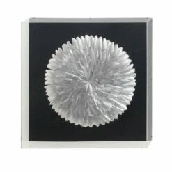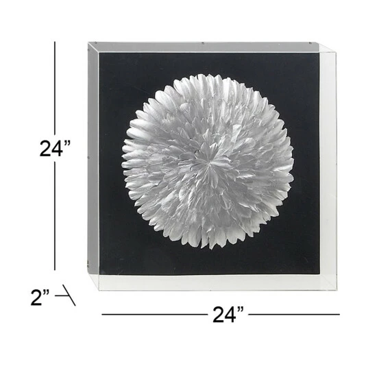 Captivate your guests in your lovely abode with this shadow box wall dรฉcor! This wall dรฉcor features a square shadow box with multiple silver-finished feather cut-outs formed in a multi-layered circular style against a black background. It is crafted from paper, acrylic, linen, and wood materials that guarantees a long-lasting use. Hang this shadow box for an added charm in your bedroom or living room. With its metallic silver and black polish, this wall dรฉcor is sure to enthrall friends. Take this lovely piece now for a lasting quality at a reasonable price!