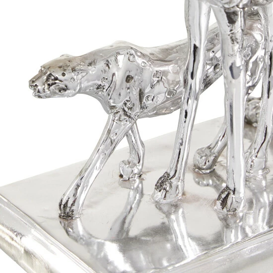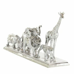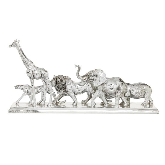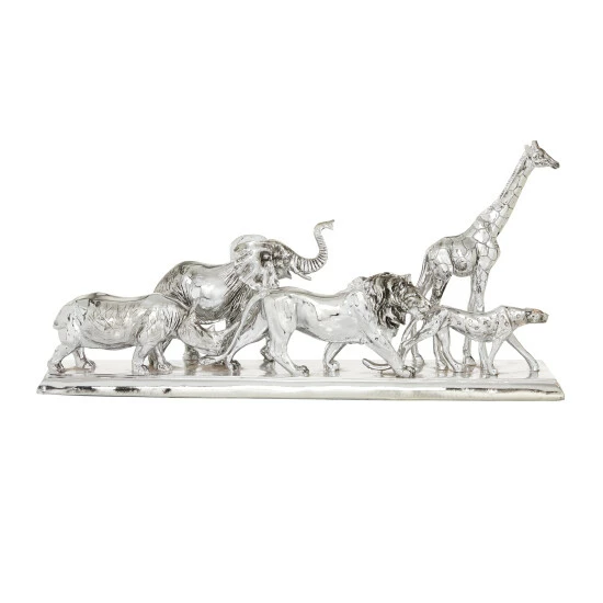 Sculpted into five detailed safari animals, this home decor includes a leopard, giraffe, lion, elephant, and rhinoceros. Each animal has a metallic silver finish and detailed characteristics, such as spots, facial features, skin texture, muscles, and fursβmaking this metallic decoration a masterpiece! Portrayed in a walking position, these safari animals are secured to a wide rectangular base. This polystone safari animal sculpture will definitely put an artistic twist on homes with contemporary interior. This will add some character in you contemporary style interior design when placed on desks or shelves. Wipe clean with a dry cloth. Suitable for indoor use only. Contemporary design. This item comes shipped in one carton.