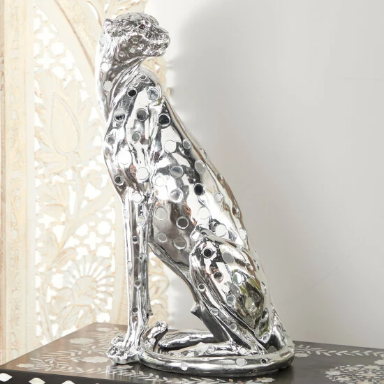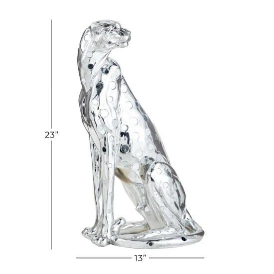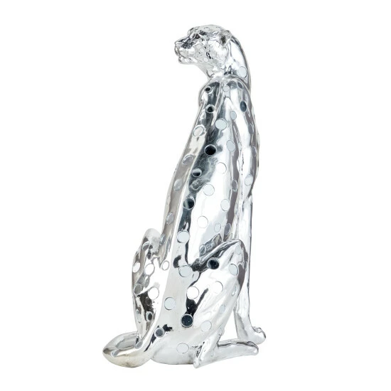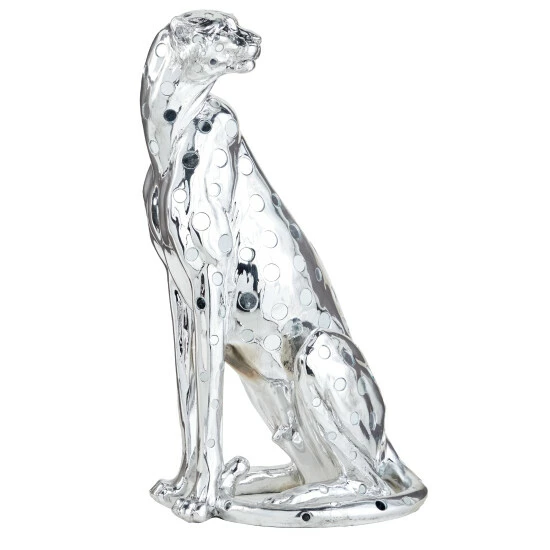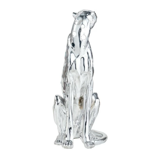 This large leopard statue shows the tranquility of nature. It features a silver finish and detailed characteristics like facial features, skin texture, muscles, and spots. Portrayed in a sitting position, this silver leopard decor will definitely put an artistic twist on homes with modern and eclectic interiors. Let it provide a sense of calm to any atmosphere by displaying it on top of a shelf, countertop, mantel, or an accent table. Made of polystone, this accent decor is truly unique and remarkable. Turn it into an eye-catching centerpiece by placing it against plain colored backgrounds. Designed with stoppers at the base that prevent scratching furniture and table tops, as well as sliding around. Wipe clean with a dry cloth. Suitable for indoor use only. Eclectic design. This item comes shipped in one carton.