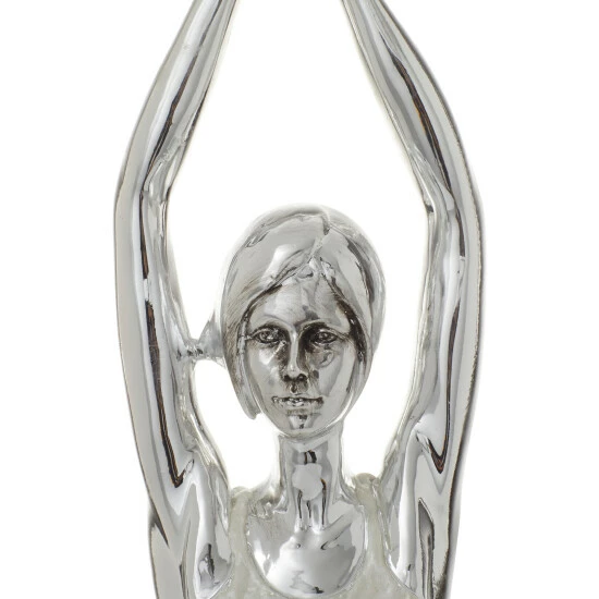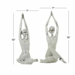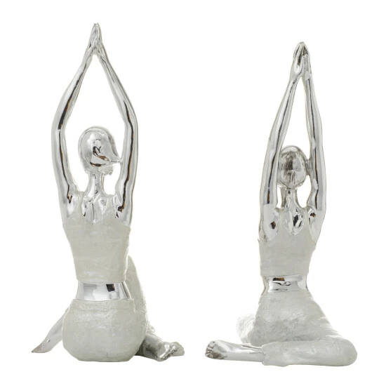 Take your home decoration to the next level with this set of polystone art yoga sculptures. The pair of figurine sculptures feature two women in yoga positions. The polystone statues have polished silver finishes and highlights amazing intricate detailing. These incredible yoga sculptures will enhance your home with a perfect mix of form and function. Use as figurine displays on top of accent tables, mantels, and countertops. Designed with stoppers at the base that prevent scratching furniture and table tops, as well as sliding around. Wipe clean with a dry cloth. Suitable for indoor use only. Yoga Sculptures come as a set of 2. Glam inspired. This item comes shipped in one carton.