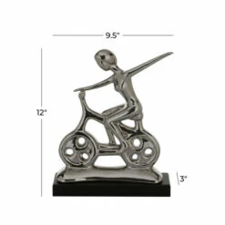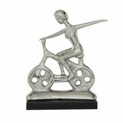 - Features a sculpture of a cyclist riding a bicycle in one hand in smooth silver finish standing on a rectangular black platform