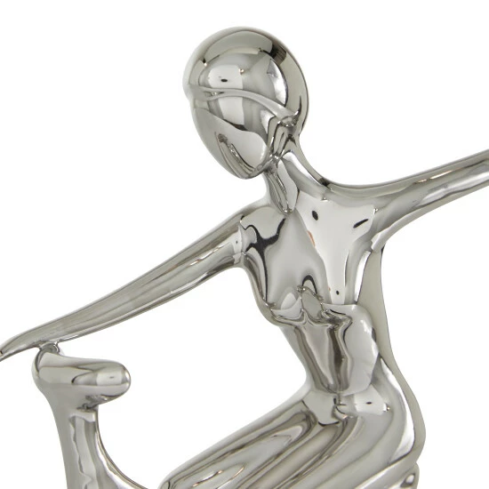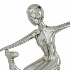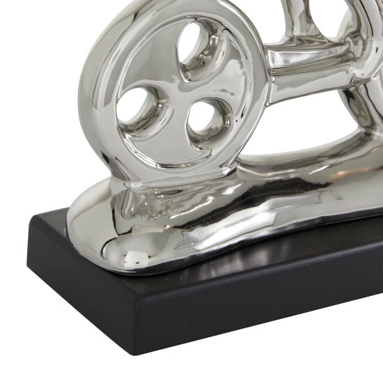Full of character and charm, this ceramic cyclist sculpture is playful addition to any home. With its high sheen silver glaze and sturdy base, this accent décor piece is a great accent for bookshelves, desks, or console tables. Sculpture measures 9.5″ in width and 12″ in height.