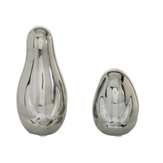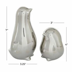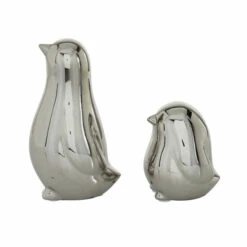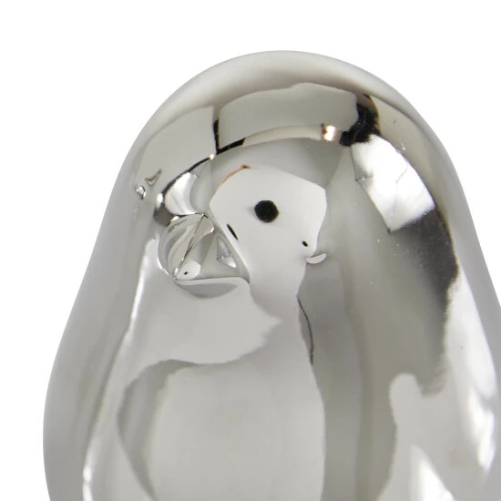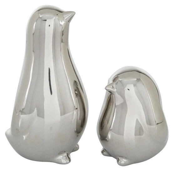 Give a thoughtful gift to your friends or family who are bird lover. This pair of metallic silver bird sculptures feature two round bird, one large and one small, with penguin-like silhouettes. The electroplated silver creates a smooth, chrome-like finish with high-shine. White rubber stoppers beneath each sculpture prevent scuffs or sliding on any tabletop. Treat yourself to this adorable yet elegant bird sculpture set and display in your foyer, living room, or anywhere needing a couple of friendly companions. This item comes shipped in one carton. Suitable for indoor use only. This set includes 2 decorative sculpture. Contemporary design. Porcelain sculpture makes a great gift for any occasion.