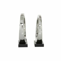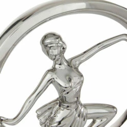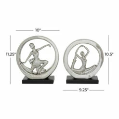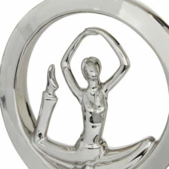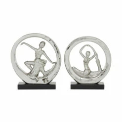 This is a set of human figurines showcasing yoga poses inside circular frames. Each of the two sculptures has a shiny silver metal finish, a porcelain construction, and a wooden (MDF) stand. Place them together or separately on a polished furniture top or on a side table inside a modern interior to best admire their silhouette. This set will make good use of your contemporary style interior and improve its aesthetics easily. Wipe clean with a dry cloth. Suitable for indoor use only. This is a 2-in-1 set of human figurines. Contemporary design. This item comes shipped in one carton.