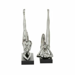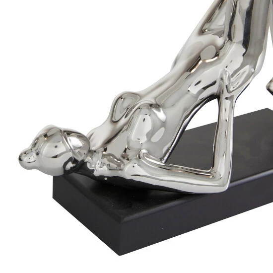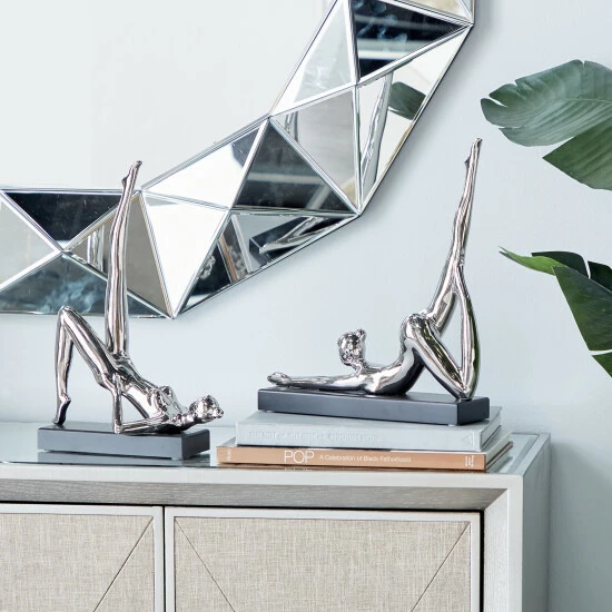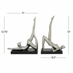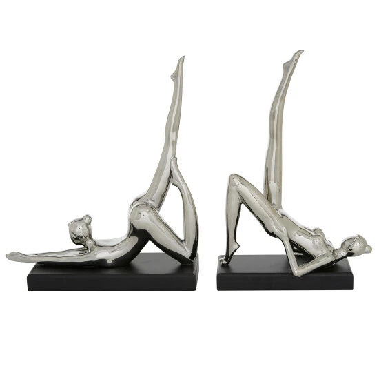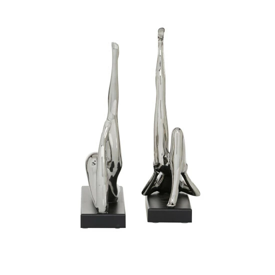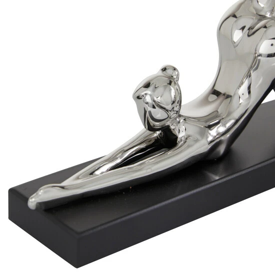 Elevate your home with this set of ceramic sculptures. The pair of figurine sculptures features two women in yoga positions. The ceramic statues has smooth, metallic silver finishes and delicate details. Each ceramic statue is nestled on a rectangular wooden base in a black finish. These yoga ceramic sculptures will enhance your home with a perfect mix of form and function. Place on accent tables, shelves, or countertops to highlight modern and contemporary style interiors. Easy to place and decor on side tables or shelves on living room or office room area. Wipe clean with a dry cloth. Suitable for indoor use only. These figurine sculptures come as a set of 2. Contemporary design. This item comes shipped in one carton.
