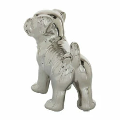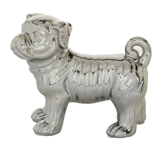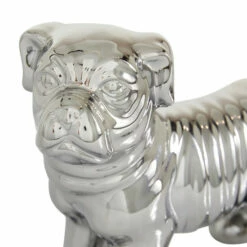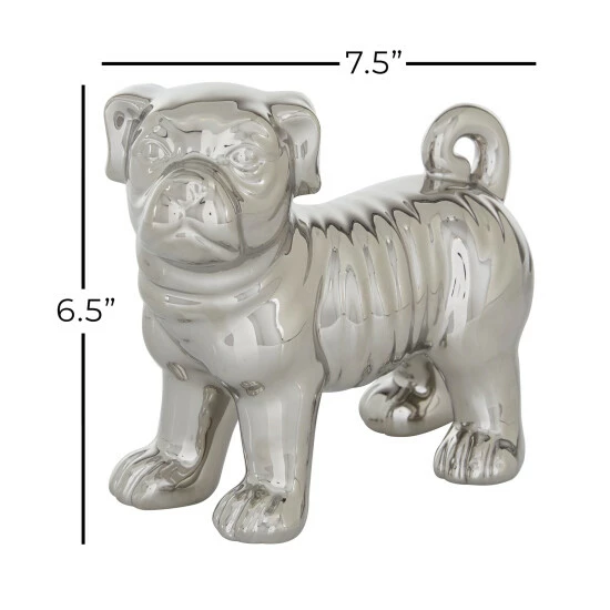 Give the best gift to your friends or family who are bulldog parents or dog lovers. This metallic silver bulldog sculpture features a detailed small bulldog statue with a curled tail, wrinkled skin, and an adorable face! The electroplated silver creates a smooth, chrome-like finish with high-shine. Treat yourself to this adorable yet elegant dog sculpture and display in your foyer, living room, or anywhere needing a friendly companion. Designed with black rubber stoppers at the base that prevent scratching furniture and table tops, as well as sliding around. This item is shipped in one carton. Suitable for indoor use only. Glam Design. Porcelain sculpture makes a great gift for any occasion.