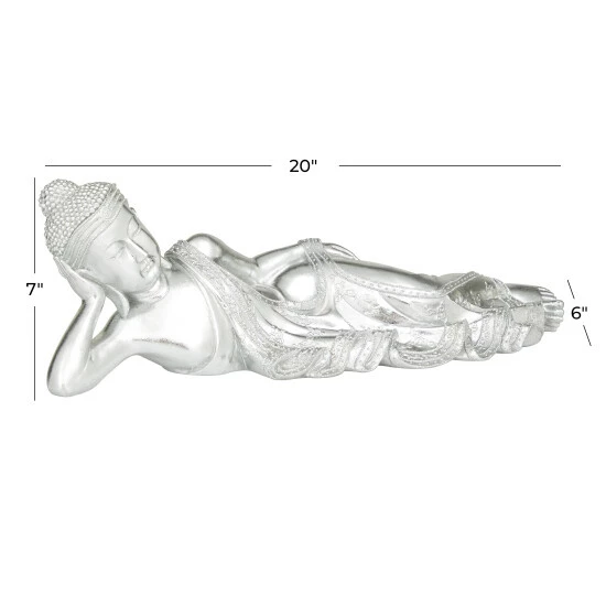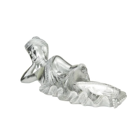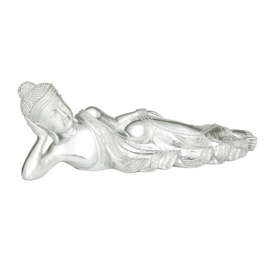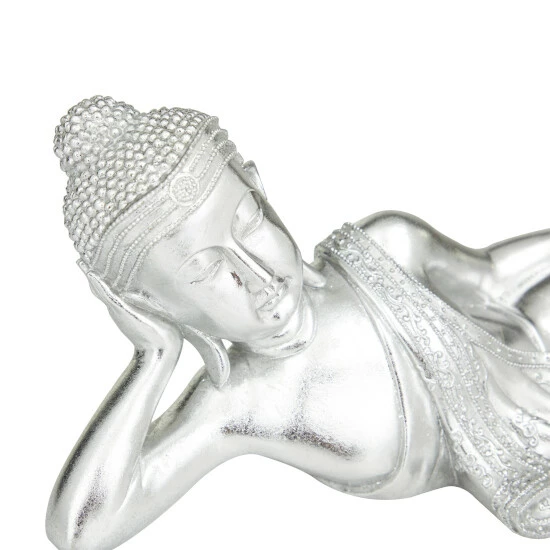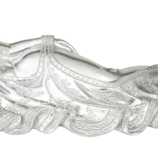 - Bohemian decorative sculpture featuring a silver buddha figure in a resting position designed with detailed facial characteristics, ushnisha, and robe with beautiful flourishes