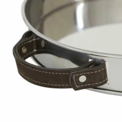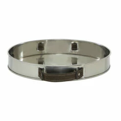 This round silver aluminum serving tray is here to give your industrial-themed home an elegant and classic vibe. Made from aluminum, it flaunts a high sheen natural silver finish with 2 conveniently placed buttoned leather handles. Use as a serving tray or as a decor holder on your coffee, console, and kitchen tables, this chic round tray is sure to add a modern touch to your industrial home spaces. Please note that this item is for decorative purpose use only and are not food safe. This item ships in one carton. Ideal decor that works best in contemporary themed homes. Made with aluminum. Features a high gloss natural silver finish. Functions as serving tray or as decor holder. Item measures 14″L x 14″W x 2″H and weighs 2 lbs