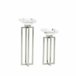 Use this decorative candle holder set to add light and elegance to your dining room or living room. Delight your guests and make any occasion extra special by adding a lighted or flameless candle to this candle holder centerpiece. Made with a sturdy base, it is perfect for creating an elegant atmosphere at your table top or mantel. This decorative candle holder set will hold two pillar candles. This item comes shipped in one carton. Suitable for indoor use. Made in India. This is a two-piece candle holder set from India. Glam inspired.