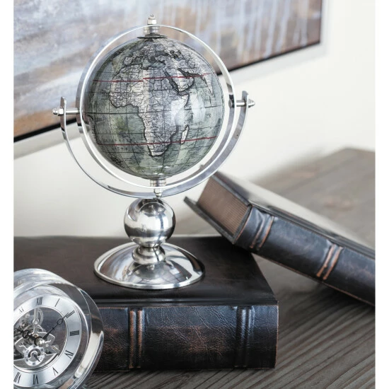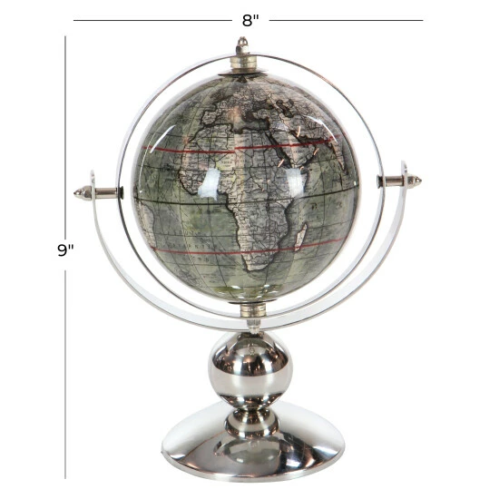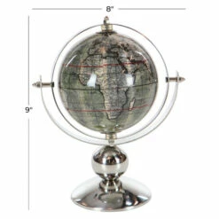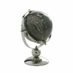 Whether displayed on your office desk or in your home, this beautifully detailed world globe makes eye-catching accent decor. The small globe is on an upright axis and features metallic silver labeled countries on each continent. The oceans are also silver with all capital letters and longitude, latitude, and meridian lines. The stainless steel axis, ring, and stand bring a modern and contemporary look to this stately table decor. Designed with black rubber stoppers at the base that prevent scratching furniture and table tops, as well as sliding around. This item ships in 1 carton. This world globe measures 5″ diameter. Due to the handmade nature of this item, no two will be alike, there will be slight differences in shape, size, and color. Suitable for indoor use only. Made in India. Traditional theme.