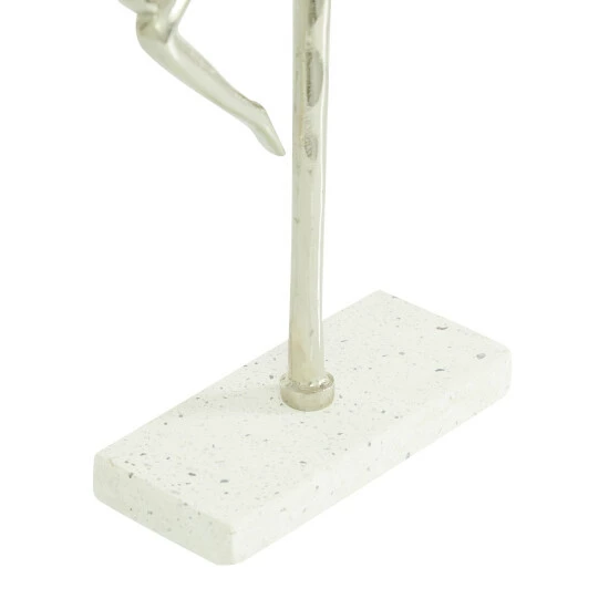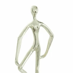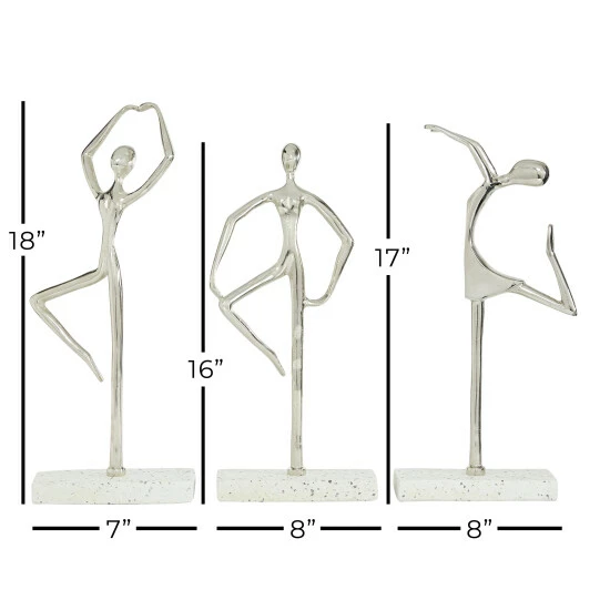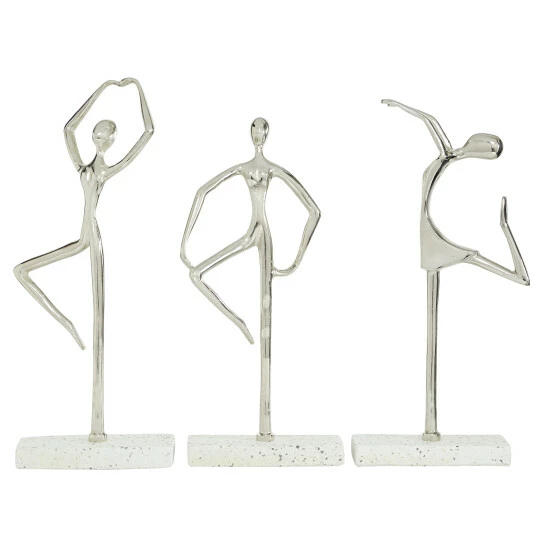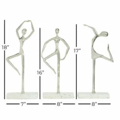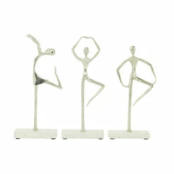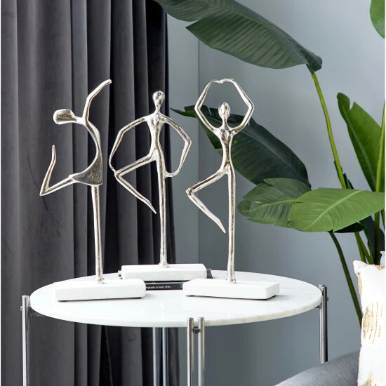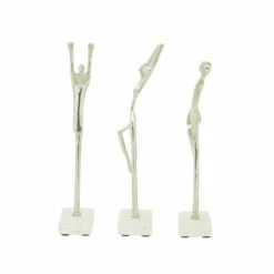 This is a set of dancing human figurines showcasing dynamic ballet movements through the use of lengthened limbs in the design. Each of the three sculptures has a smooth glossy metal surface and a platform stand. Place them on a bare furniture surface or on a mantelpiece inside a modern-themed room to admire their design concept. Heights are 16″, 17″, and 18″, respectively. The materials used are aluminum and terra cotta. This set will turn your modern style inspired interior into a minimalist wonder in no time when displayed on tables or desk. Wipe clean with a dry cloth. Suitable for indoor use only. Made in India. This is a 3-in-1 set of dancing human figurines. Modern design. This item comes shipped in one carton. Terrazzo sculpture makes a great gift for any occasion.