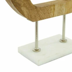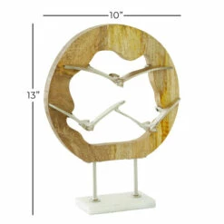 Complete your contemporary or coastal look with this one of a kind mango wood and aluminum framed bird sculpture table decor. A round chunk of natural mango wood from India with light gold and beige tones is carved out in the center, creating a wavy silhouette that frames three flying bird sculptures. Each bird is crafted from metallic silver aluminum with a textured finish. Two silver metal posts prop this sculpture up and attach at the white stone base. This item is shipped in one carton. Suitable for indoor use only. Made in India. Contemporary design.