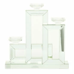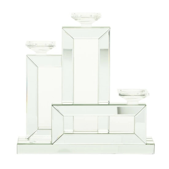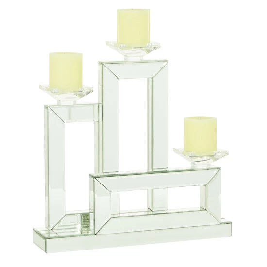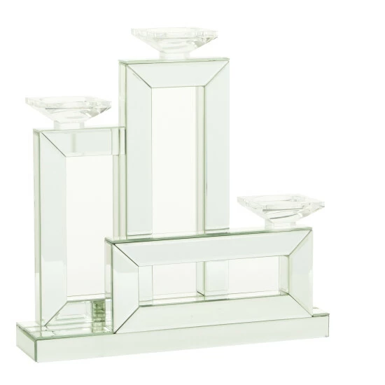 Use this candle holder centerpiece to create a dazzling scene on your mantel or end table. Delight your guests and make any occasion extra special by adding a lighted or flameless candle to this candle holder centerpiece. Made with a sturdy base, it is perfect for creating an elegant atmosphere at your table top or mantel. Designed with black rubber stoppers at the base that prevent scratching furniture and table tops, as well as sliding around. This decorative candle holder will hold three pillar candles. This item comes shipped in one carton. Suitable for indoor use. Glam inspired.