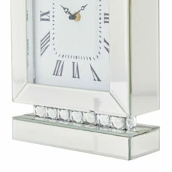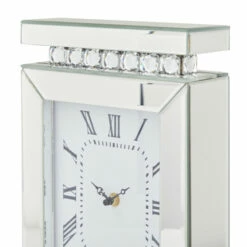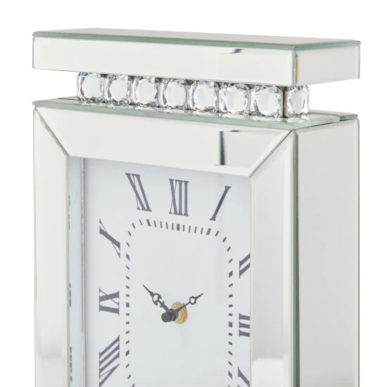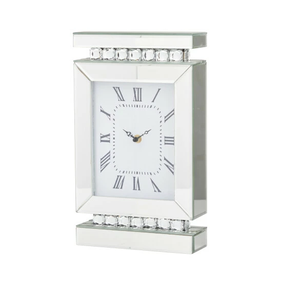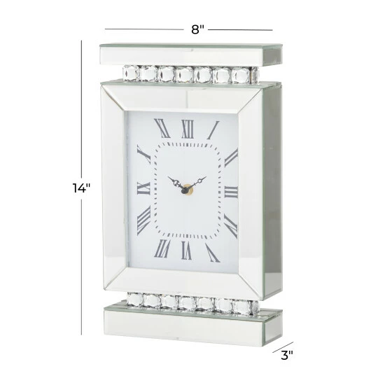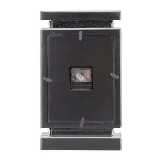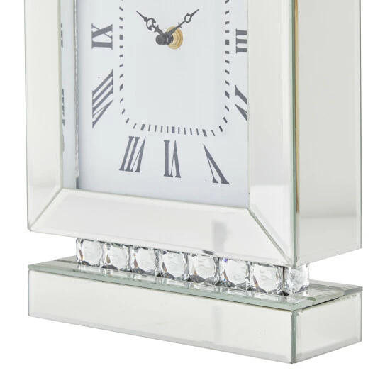Track your time while stepping up your interior design with this striking clock that is perfect to display on top of any accent table. Keep track of time the old fashion way with these stylish clocks. A dashing display on any surface to help you manage your time throughout the day. Requires 1 AAA battery. This item comes shipped in one carton. The white clock face shows black Roman numerals and small black unique clock hands. The clock mechanism runs silent. The wood material is encased in reflective glass panels that give a more chic and sophisticated look. Suitable for indoor use only. Glam theme.