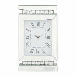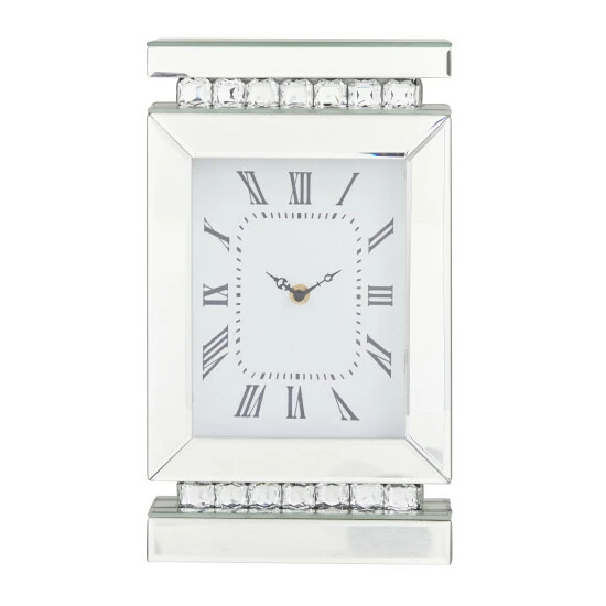 - A rectangular table clock flaunting a white clock face designed with black Roman numerals and small clock hands encased in a wood and glass frame with crystal accents on top and bottom areas