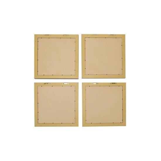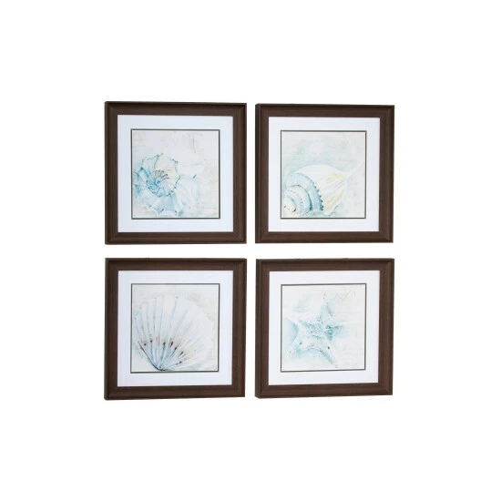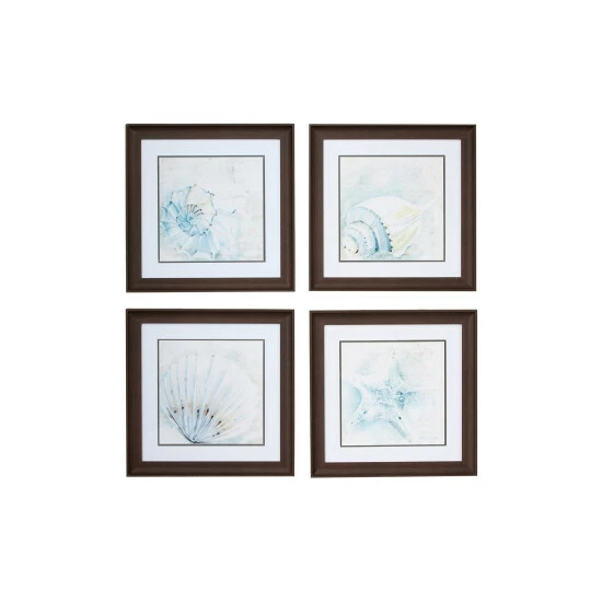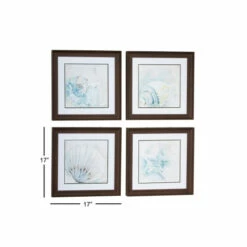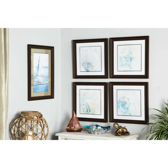 Cool watercolors form fluid illustrations of conch shells, a scallop shell, and a starfish in this set of 4 framed coastal wall art. These screen-printed coastal artwork prints look like watercolor paintings in light blue, aqua, and muted gold and have diluted, light script in the background for more subtle texture and an artistic touch. Each square frame is made of solid MDF and has a smooth, textural espresso brown finish. These coastal decor pieces make for excellent seashell decor for your bathroom and foyer.