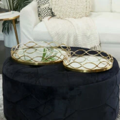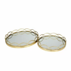 Functional and aesthetically pleasing, this set of stainless steel round tray set is a fabulous accent piece that gives flair to your console table or side table. A versatile piece for storage or as a decorative display on any surface space. Keep your table top protected as you display your memorabilia and belonging on these trays. This item comes shipped in one carton. Please note that this set is for decorative purpose use only and are not food safe. Suitable for indoor use. Made in India. This set comes with 2 decorative trays. Contemporary Design. A contemporaryย style offers neutral elements and basics form with a bold design. These contemporary style decorative trays are crafted of solid reflective mirror and stainless steel materials. This set of 2 decorative trays comes in a finish that suits any contemporary style interior. This decorative tray set features round structures inlaid with reflective mirror panels supported by stainless steel frame with marquise-shaped cut-out borders. Each tray measure 18″L x 18″W x 3″H, 14″L x 14″W x 3″H and weighs 11 lbs
