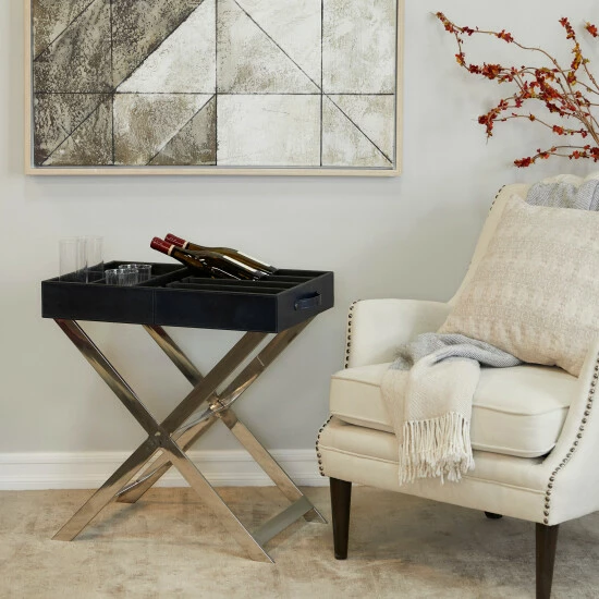 - This accent furniture highlights a rectangular wine rack with spacious storage for wine bottles designed with black exterior with side handles and supported by x-shaped stainless steel stand
