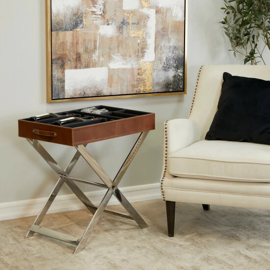 - This functional table inspired wine storage is furnished with a black leather exterior and a silver stainless steel stand